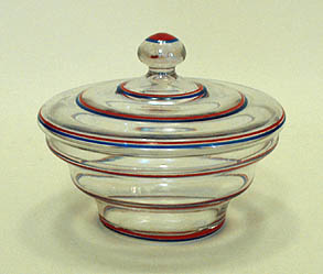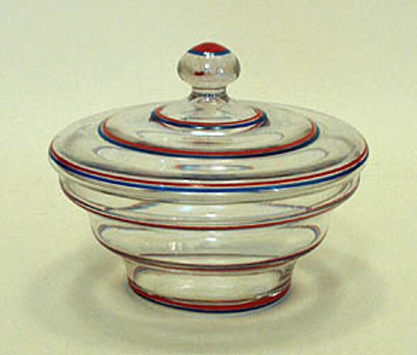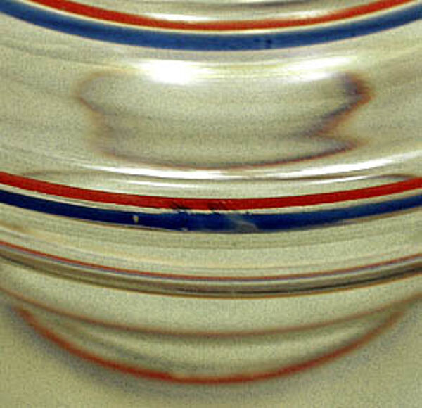 profilierte Silhouette, schmale blaue und rote Bänder - handgemalt, H. 11 cm, minimale Gebrauchsspuren; leichte, herstellungsbedingte Verwischungen der Bänder, ungemarkt, 1930er