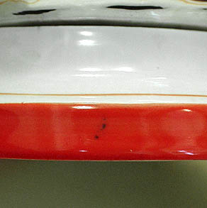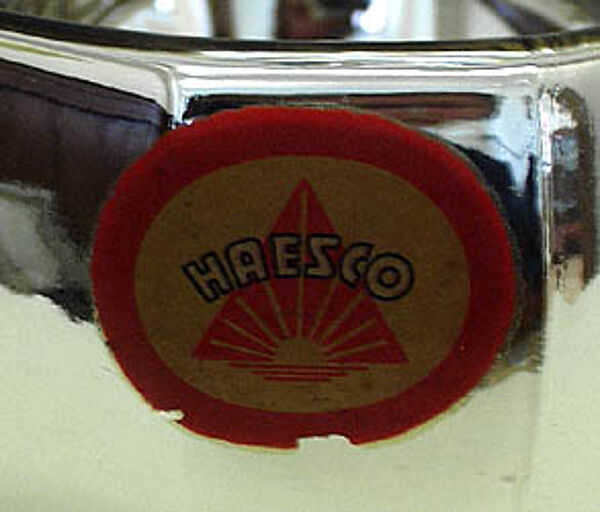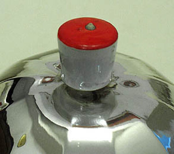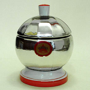 12-eckiger Korpus aus silberfarben beschichtetem Glas, Deckelgriff und runder Stand aus Porzellan mit roten Bändern, H. 16,5 cm, herstellungsbedingte Erhöhung Oberseite Griff, 2 dunkle Punkte in der Glasur, Aufkleber HAESCO, 1920er/30er