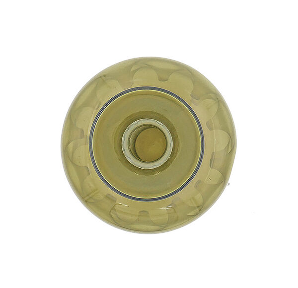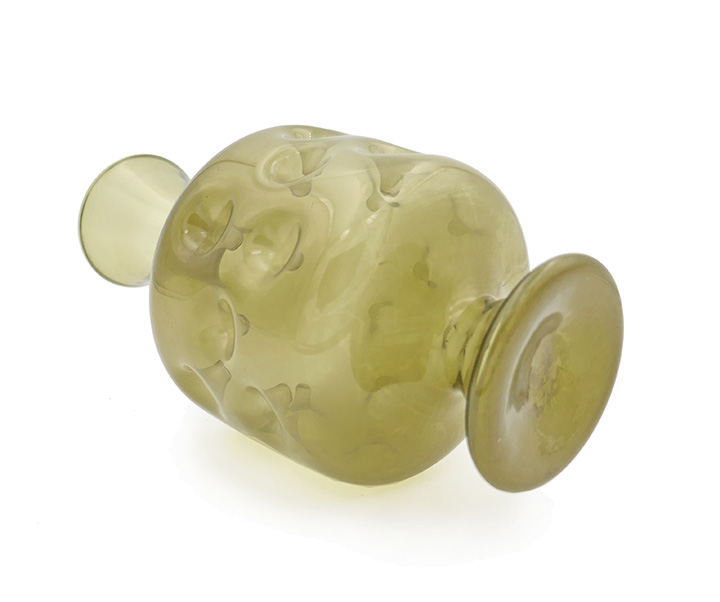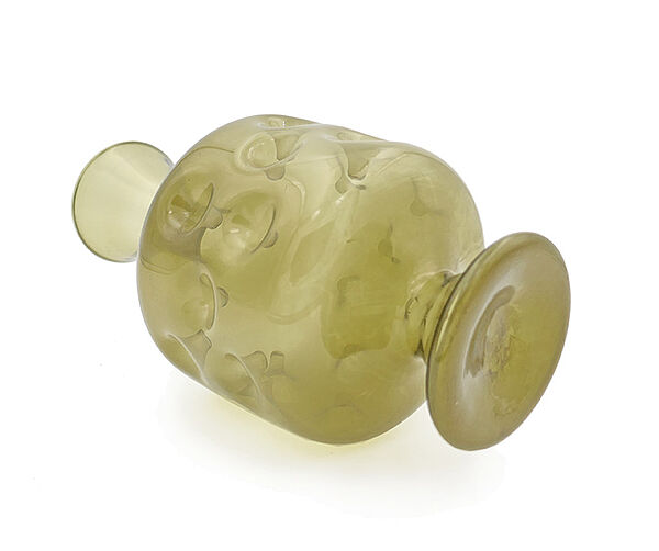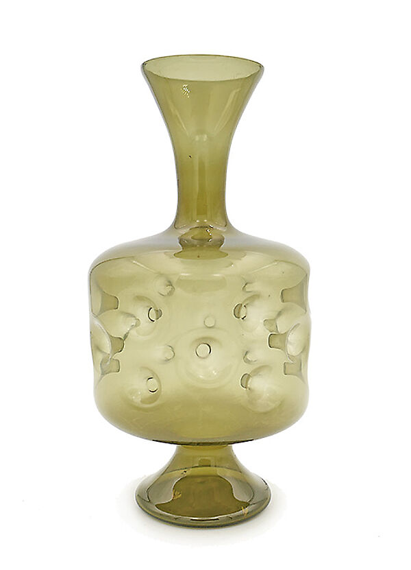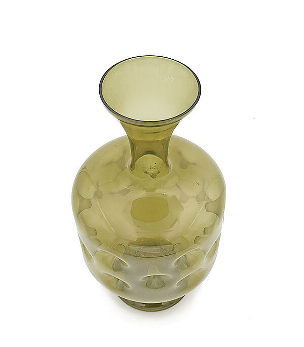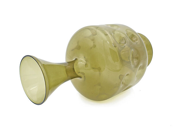 Mundgeblasener, olivgrüner Glaskorpus auf trompeten-förmigem Fuß; der zylindrische Bauchbereich weist viele nach innen gerichtete "Einstiche" auf (wie man sie bei den mittelalterlichen Daumengläsern kennt); auch der relativ lang gestreckte Halsbereich wirkt trompeten-förmig, er öffnet sich nach oben allmählich. Höhe ca. 19 cm, geringe Altersspuren. Wohl Lauscha der 1960er, 70er Jahre.