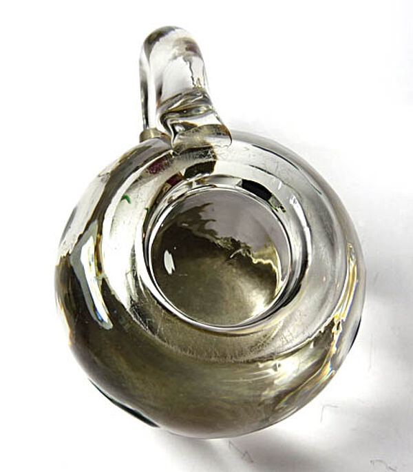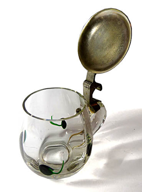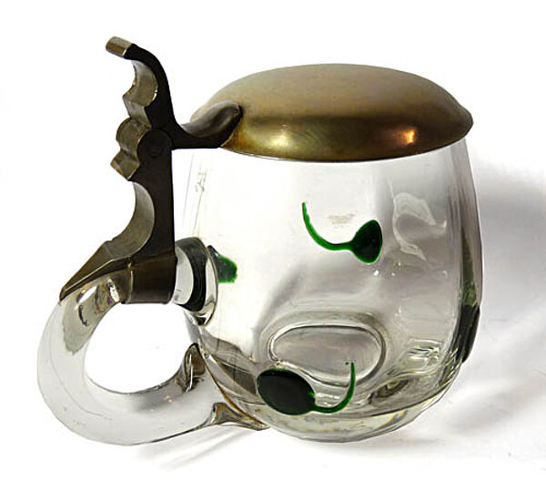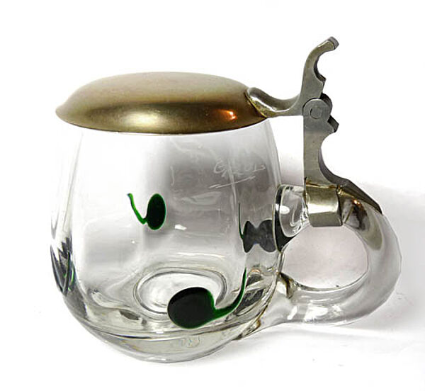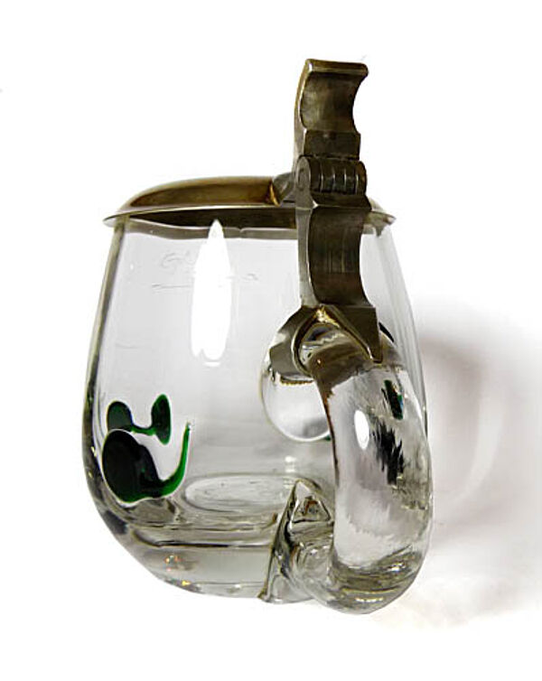 Korpus aus geblasenem Klarglas mit C-förmiger Handhabe und aufgesetzten grünen Noppen, die einseitig einen ausgezogenen Faden aufweisen. Verschliffener Mündungsrand, scharnierter Metalldeckel (wohl Nickel-Legierung) mit einfachem, schlanken Daumendrücker. Gravierter Eichstrich und Bezeichnung "0/20 L". Höhe des Glaskorpus' ca. 9,5 cm, mit Deckel ca. 10,5 cm, bis zur Handhabe ca. 12 cm. Geringe bis allenfalls moderate Gebrauchsspuren (so zeigen sich vereinzelte Kratzspuren). Hergestellt wohl von Ferdinand Carl Benedict von Poschinger in Oberzwieselau nach einen Entwurf von Carl Georg von Reichenbach um 1910.