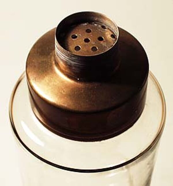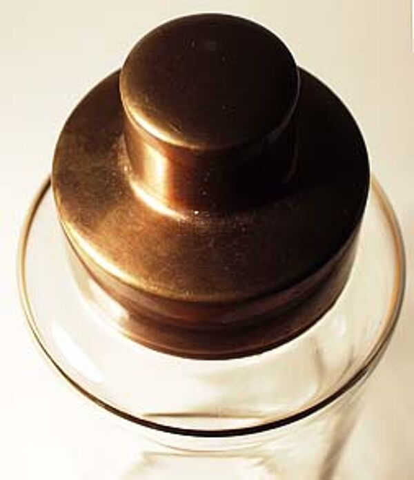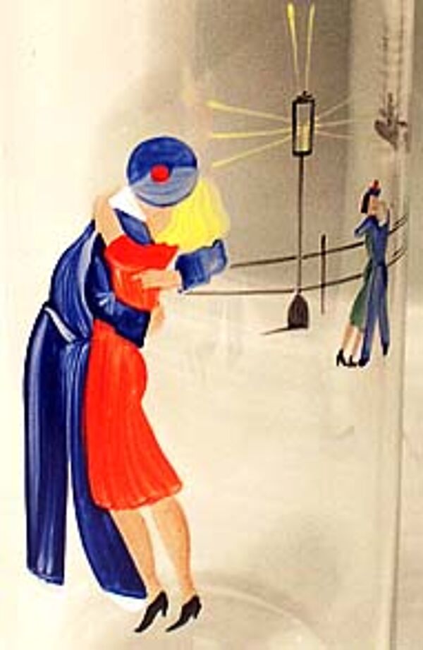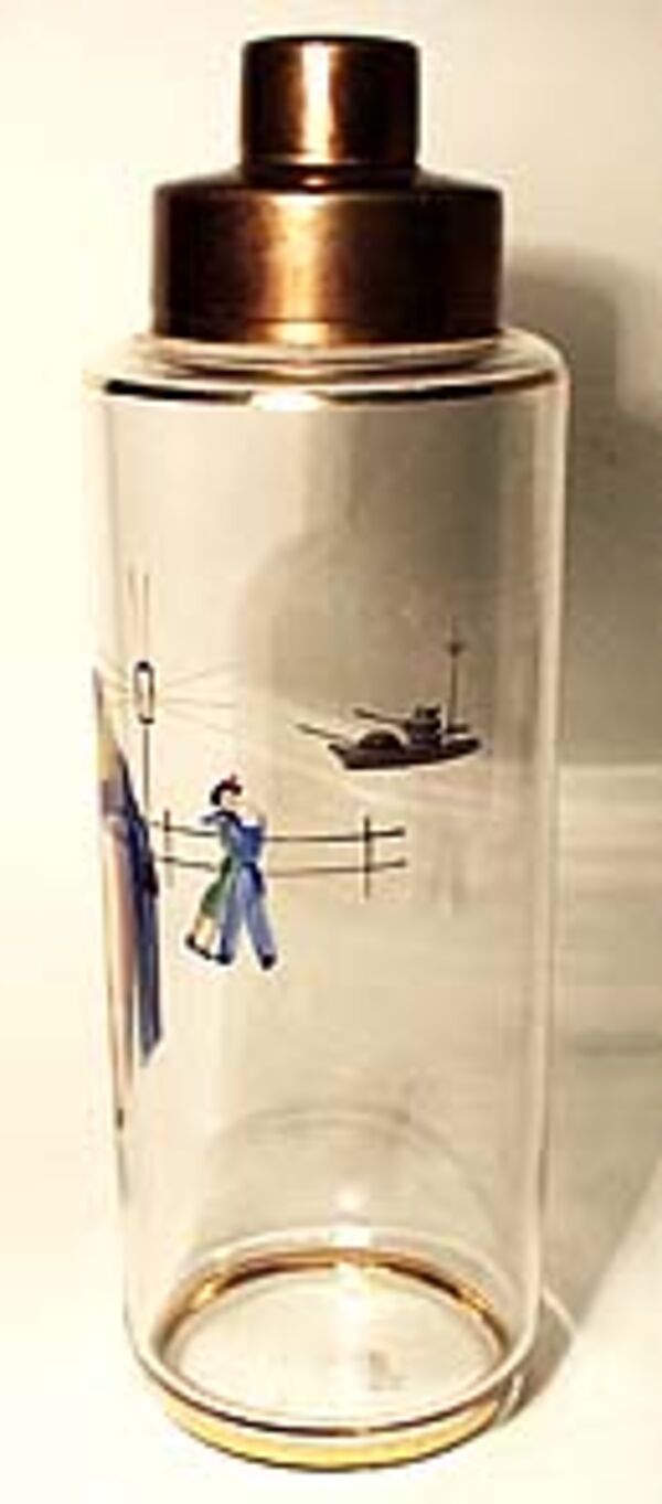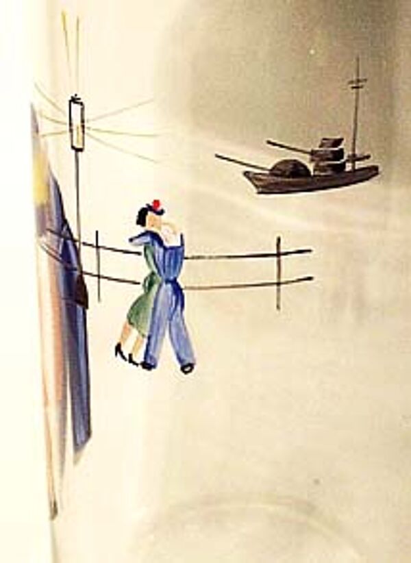 Der zylindrische Korpus aus klarem Glas ist mit einer polychromen Emaille-Handmalerei versehen: ein Matrose küsst eine Frau im leuchtend roten Kleid, im Hintergrund ein weiteres Paar unter einer Laterne sowie ein Kriegsschiff. Der zweifache Messingverschluss gestattet einmal einen ungefilterten und einmal einen "gesiebten" Ausguß. Das Messing zeigt eine weitestgehend gleichmäßige Patina (ungeputzt). Höhe ca. 28,5 cm. Unbezeichnet, wohl 30er bis 50er Jahre.