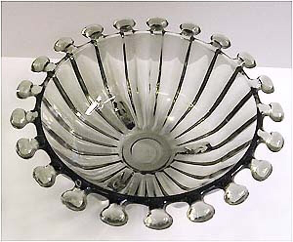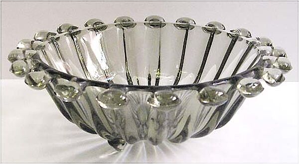 Der schalenförmige Korpus aus turmalin-farbenem, feuerpoliertem Pressglas wird außenseitig durch aneinandergereihte, bandförmige Stege untergliedert, die sich im Randbereich in linsenartige Adnexe fortsetzten. Unterseitig plan geschliffener Boden, zudem drei sich flach vorwölbende Füße. Außendurchmesser ca. 19 cm, Höhe ca. 6,5 cm, minimale Gebrauchsspuren. Unbezeichnet, wohl Ende der 1960er, Anfang der 1970er Jahre. Evtl. VEB Glaswerke Schwepnitz, Entw. evtl. Fritz Keuchel (*1933)??
