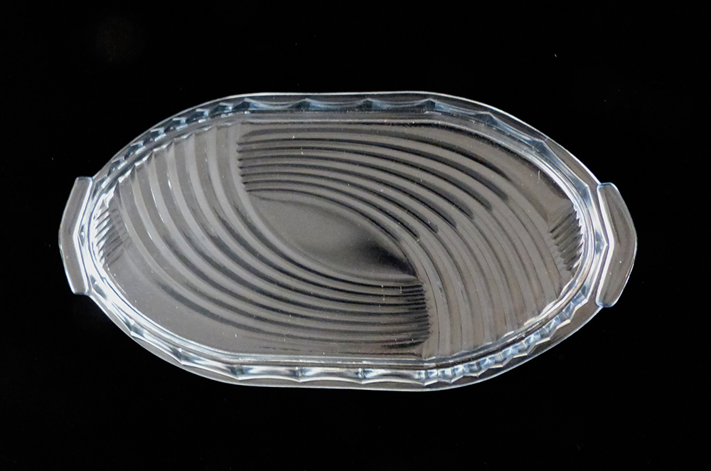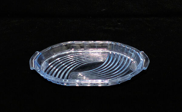 Ovalärer, flacher Korpus aus hellblauem Pressglas mit recht steilem Randbereich, der an den kurzen Enden jeweils zu einer flachen, fast waagerechten Handhabe ausgezogen ist. Parallel verlaufendes Rillendekor. Maße ca. 24x 12,5 cm, geringe Altersspuren. Wohl Deutschland der 1920er, 30er Jahre.