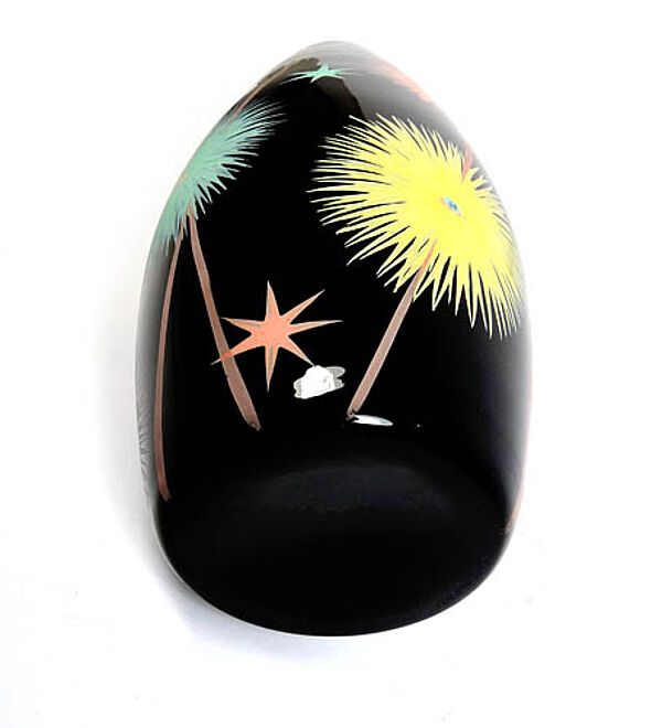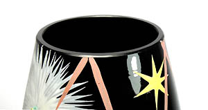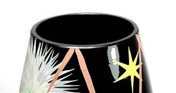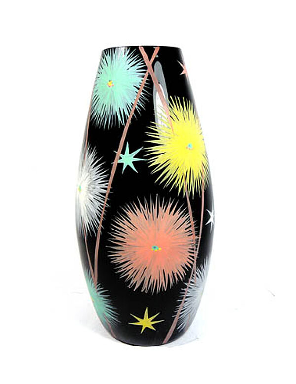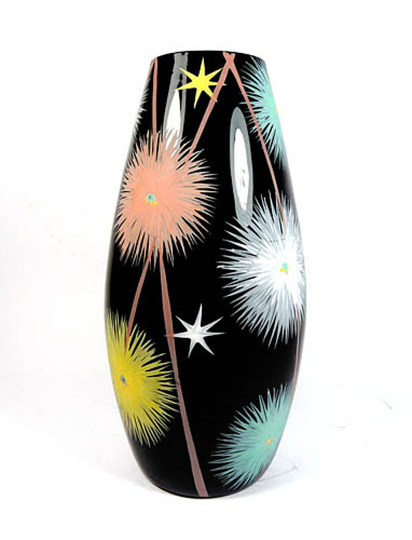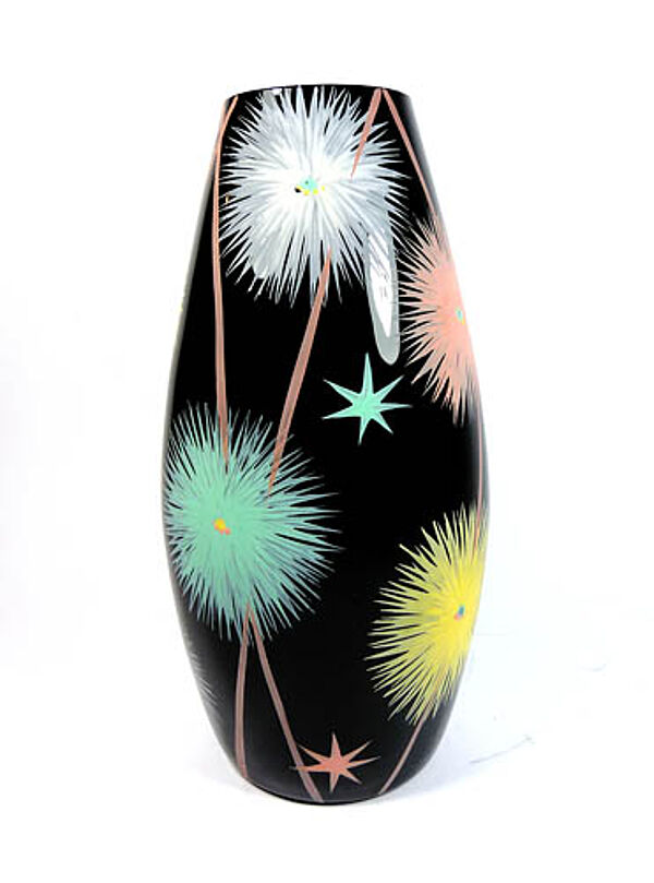 Flach gebauchter Korpus aus schwarzem Glas. Außenseitig handgemaltes polychromes, stilisiertes Blütendekor (Emaillefarben). Höhe ca. 23,5 cm, geringe Gebrauchsspuren. Ungemarkt, wohl 50er Jahre (stilistisch ist die Vase relativ sicher der FG Ilmenau zuzuordnen, siehe auch Art.Nr. 3990)