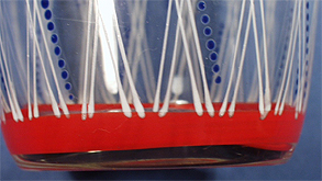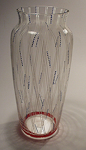 Nach unten sich leicht verjüngender, angedeutet zylindrischer Corpus. Relativ kurze Schulter mit betontem Mündungsrand. Höhe ca. 26 cm, Durchmesser ca. 12 cm. Weiß-blaue Emaille-Malerei, Standring rot akzentuiert. Wohl Böhmen der 20er Jahre (evtl. Rudolf Schrötter für Rudolfova Hut / Teplice).