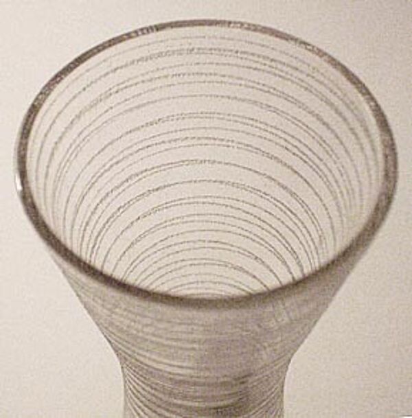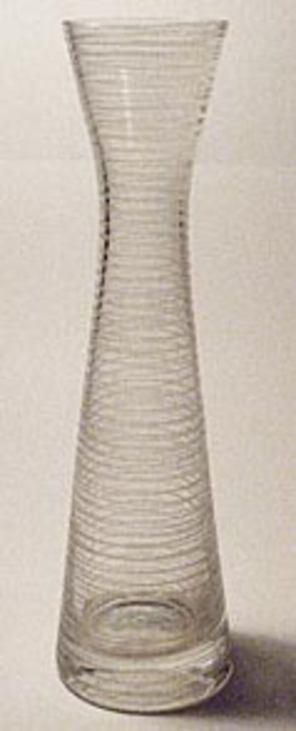 Korpus aus klarem Glas in Form zweier sich gegenüber liegender Kegel bzw. Tüten, verdickter Stand. Streifendekor. Höhe ca. 28 cm, geringe Gebrauchsspuren. Wohl Deutschland der 50er Jahre.