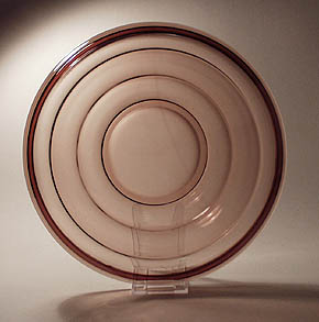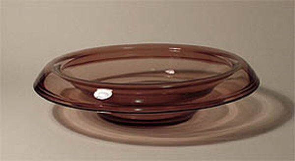 Schalenförmiger Korpus mit "umgeschlagenen" Rand aus blass-violettem Glas. Einfaches Liniendekor. Durchmesser ca. 29 cm. Höhe ca. 7 cm. Ungemarkt. wohl Böhmen der 20er Jahre (evtl. Rudolf Schrötter für Rudolfova Hut / Teplice).