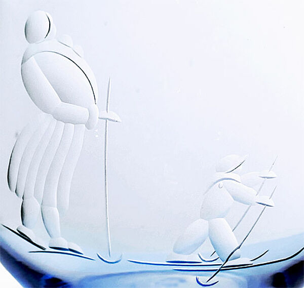 In die (angedeutete Glocken-)Form geblasener Korpus aus relativ dünnwandigem hellblauen Glas mit handgeschliffenem Motiv: Vater und Sohn (?) auf Skiern. Höhe ca. 11,5 cm, geringe Altersspuren. Flohbiss am geschliffenem Rand. Wohl 1920er Jahre.