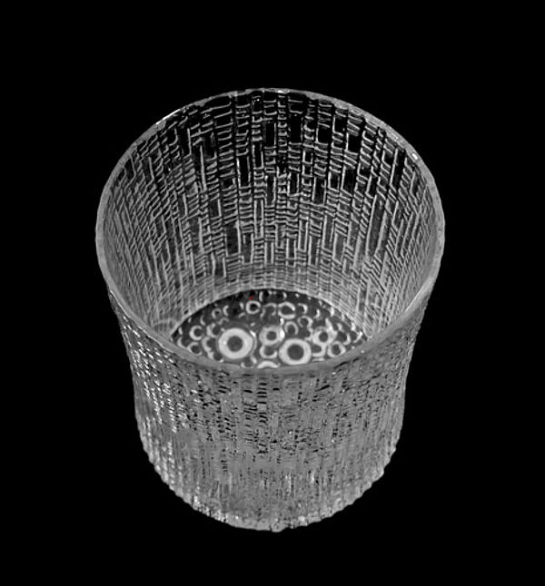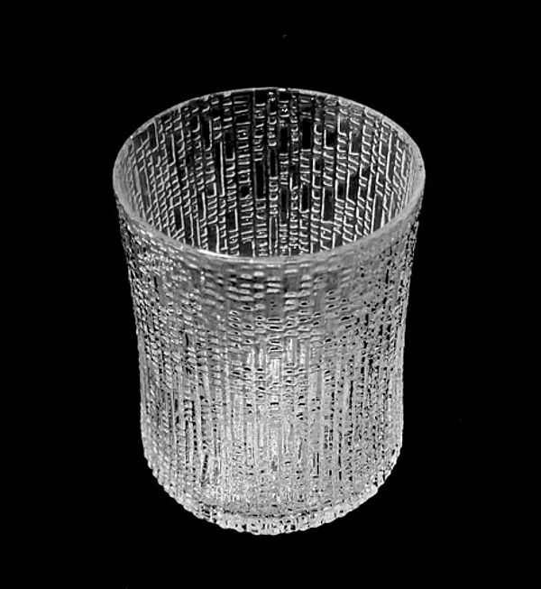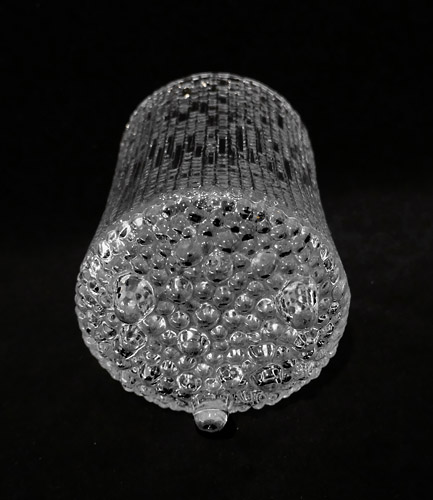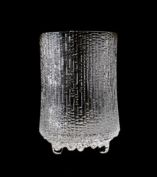 Korpus aus klarem, mundgeblasenem Glas mit außenseitig fein reliefierter, am Boden tropfeartiger Struktur, aus den sich die drei Standfüße erheben. Höhe ca. 12,5 cm, geringe Altersspuren. Entwurf von 1968, Ausführung wohl relativ zeitnah (die aktuelle Reedition zum 100. Geburtstag von Tapio Wirkkala wirkt schlanker, sofern es sich um das Bierglas der "Ultima Thule"-Serie handeln sollte, wahrscheinlicher ist eine andere Funktion, für Salzstangen, Eiswürfel?).