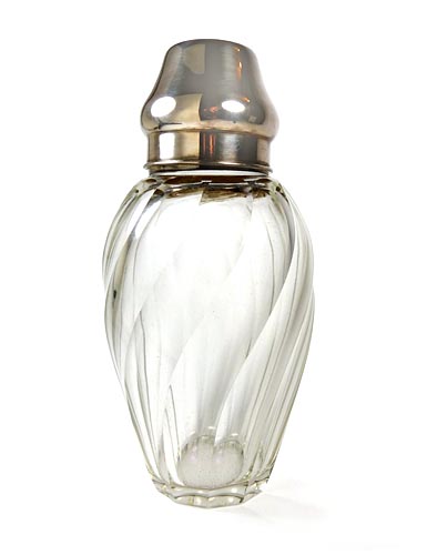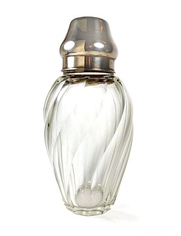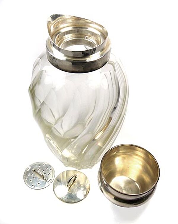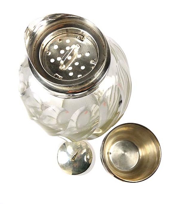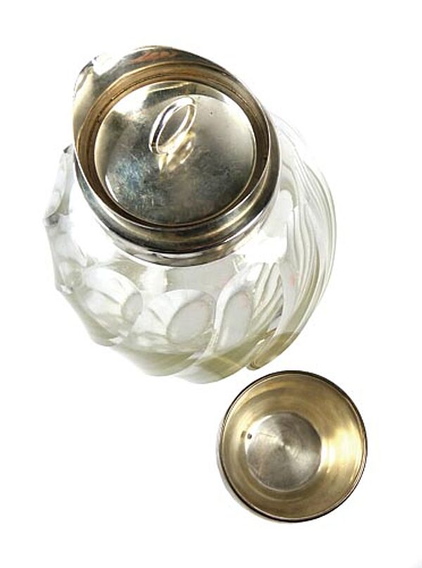 Facetiert geschliffener und flach gewölbter Korpus aus Kristallglas. Im Ausguß eingelassenes Sieb mit Drehverschluss, Deckel und aufsetzbarer Probierbecher aus Silber (925), ein winziger Führungsstift fehlt, die Funktion ist davon nicht beeinträchtigt. Höhe ca. 23 cm, geringe Gebrauchsspuren. Im Randbereich gemarkt, wohl um 1920.