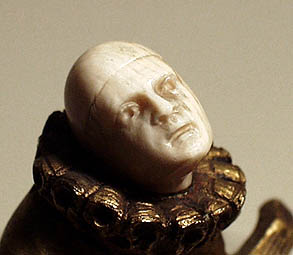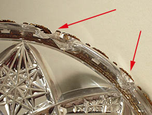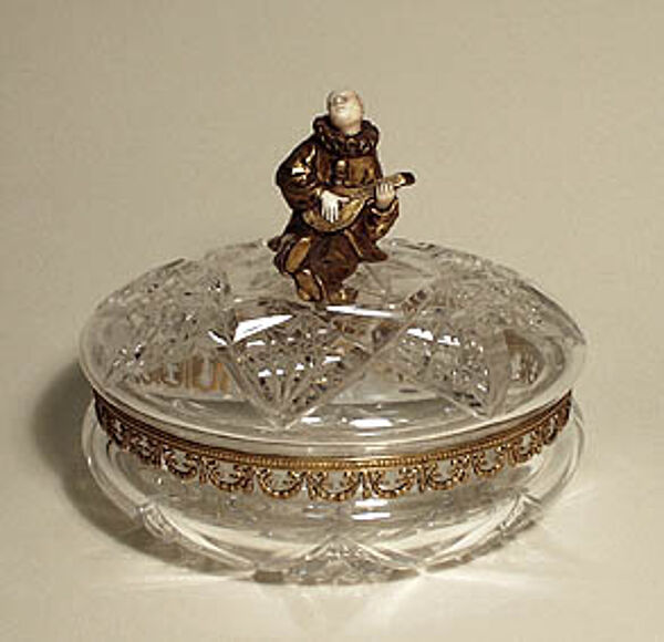Runder, abgeflachter Korpus aus sternförmig geschliffenem Kristallglas. Deckelrand mit girlandenförmiger Applikation aus goldfarbenem Metall (wohl vergoldete Bronze). Die Handhabe des Deckels ist aus dem gleichen Material und in Form eines Laute-spielenden Harlekins geformt, wobei Kopf und Hände filigran in Elfenbein geschnitzt sind. Höhe ca. 13 cm, Durchmesser ca. 15 cm. Der Deckelinnenrand weist zwar einige kleinere Abschläge auf, diese sind aber von außen nicht sichtbar bzw. durch die Metall-Applikation überdeckt. Die Skulptur ist unsigniert, erinnertaber stark an Arbeiten von Georges Omerth / Paris (Lebensdaten nicht bekannt, er war ca. von 1895 - 1925 als Künstler aktiv) oder Peter Tereszczuk (1875 - 1963 ) / Wien. Wohl 1910er, 20er Jahre.