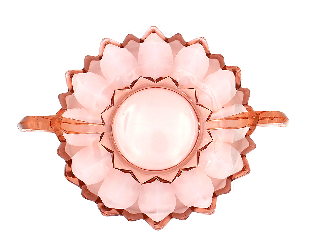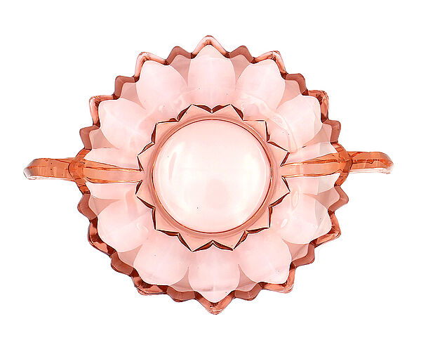 Flach schalenförmiger Korpus aus überwiegend klarem, partiell satiniertem, rosafarbenem Pressglas. Durch den gezackten Rand erinnert das Gefäß an eine stilisierte Blüte. Beidseits langgestreckte Handhaben. Maße von Handhabe zu Handhabe ca.31 cm, Durchmesser ca. 22 cm, Höhe ca. 7,5 cm, geringe Alters- und Gebrauchsspuren. Wohl Deutschland der 1920er Jahre