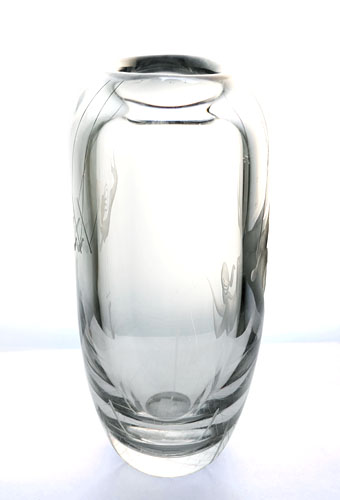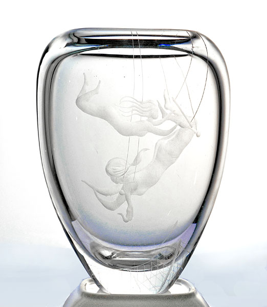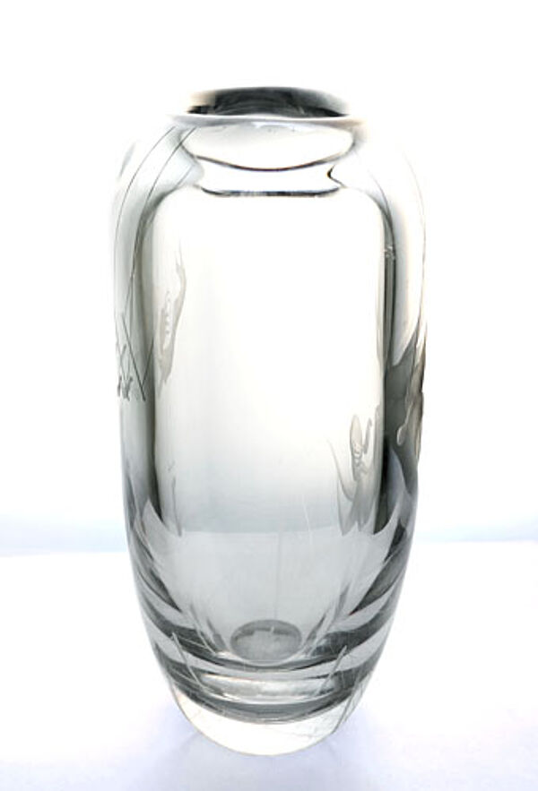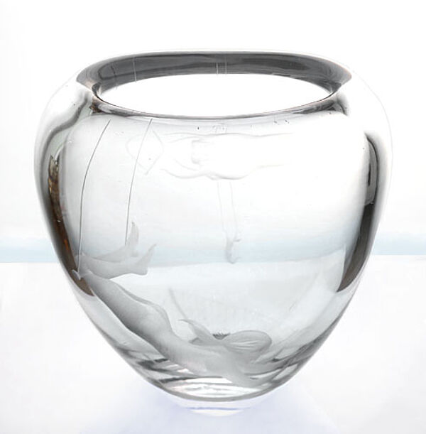 In der Draufsicht abgeflachter, sich zum planen Stand hin kontinuierlich verjüngender Korpus aus klarem Kristallglas, vorder- und rückseitig z.T. geätztes, z.T. geschliffenes figürliches Dekor: es ist jeweils ein weiblicher Akt dargestellt, der am Trapez schwingt (einmal in größerer, einmal in kleinerer Ausführung). Höhe ca. 22 cm, Breite ca. 18 cm, Tiefe ca. 10 cm, geringe Altersspuren. Unterseitig signiert, gemarkt und bezeichnet "GG2013" (Form- oder Dekornummer?). Die Vase wurde frühestens Mitte der 1950er Jahre, spätestens 1961 entworfen (in dieser Zeit arbeitete der Künstler für Afors) und vermutlich auch zeitnah ausgeführt.