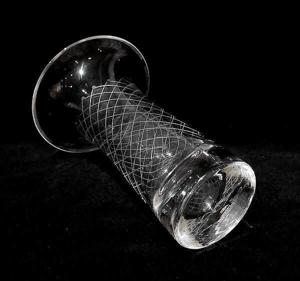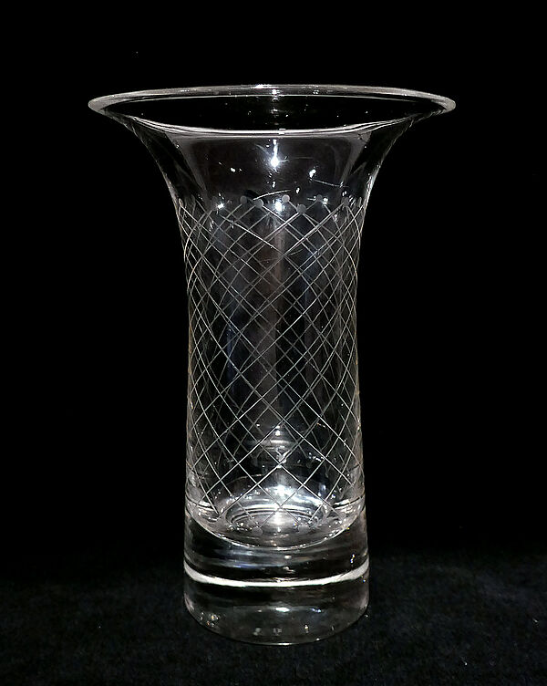 Wohl in die Form geblasener, im mittleren und unteren Drittel annähernd zylindrischer Korpus aus klarem Glas, der einen akzentuiert-konvex ausgestellten Rand und einen dickwandigen Bodenbereich aufweist. Handgeschliffenes Linien bzw. Gitterdekor. Höhe ca. 20 cm, geringe Altersspuren. Vermutlich DDR der 1960er, 70er Jahre.