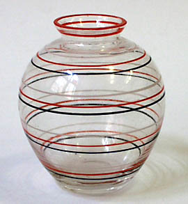 Fast kugelförmiger Korpus aus klarem Glas, sog. "Leichtkristall", Streifen- bzw. Ringdekor (Emaillemalerei), Höhe ca. 8,5cm. Wohl Böhmen der 20er Jahre (evtl. Rudolf Schrötter für Rudolfova Hut / Teplice).