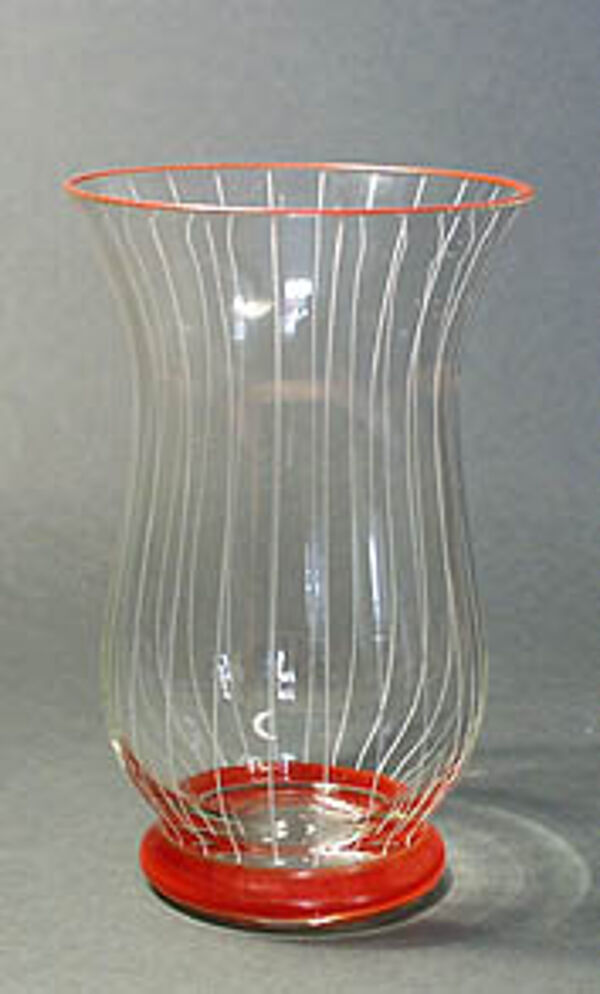 Taillierte Vase aus sog. Leichtkristall mit zartem Liniendekor in weisser und roter Emaille-Malerei. H. 15 cm. Kleinste, auf den ersten Blick nicht wahrnehmbare Gebrauchspuren am Korpus. Ungemarkt, wohl Böhmen der 20er Jahre (evtl. Rudolf Schrötter für Rudolfova Hut / Teplice).