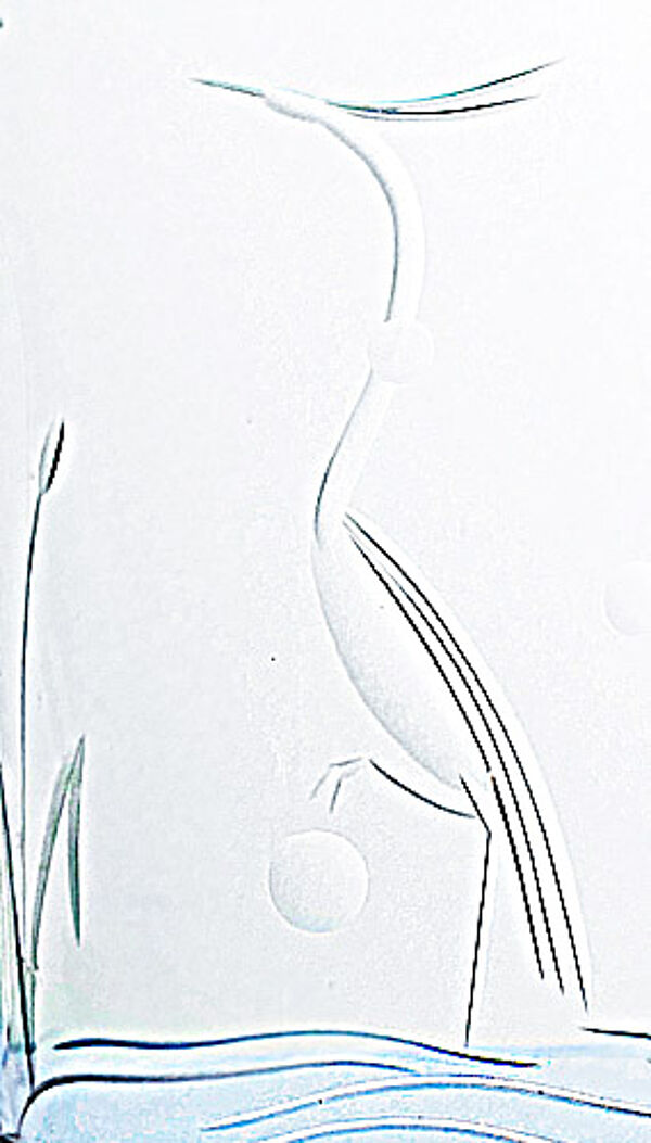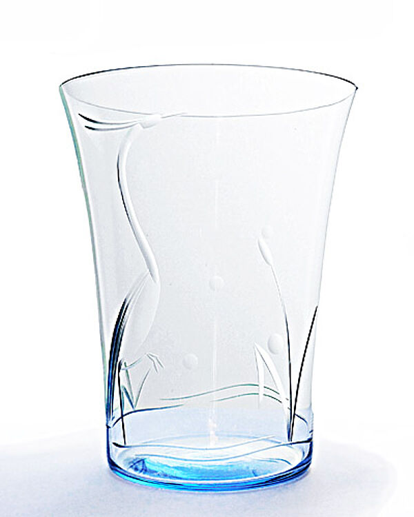 In die (Trompeten-)Form geblasener Korpus aus hellblauem, relativ dünnwandigem Glas, handgeschliffenes, filigran-bizarres Reiher-Dekor. Geschliffener Rand. Höhe ca. 16 cm, minimale Gebrauchsspuren. Wohl 1920er Jahre, vermutlich aus Richard Süßmuths Werkstatt in Penzig / Schlesien.