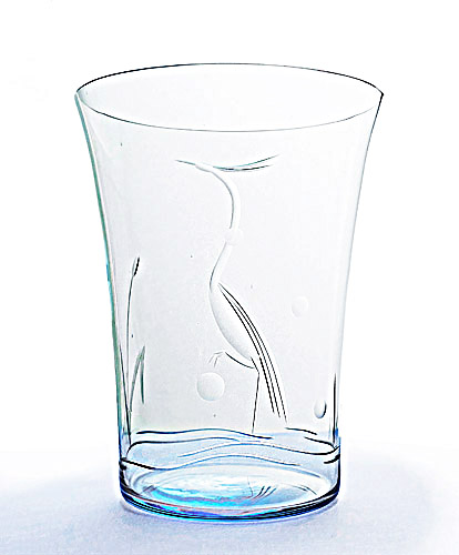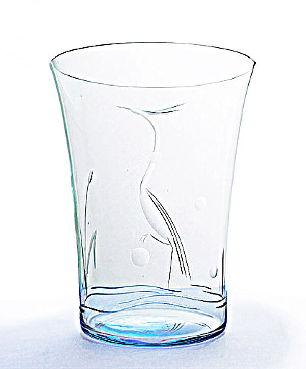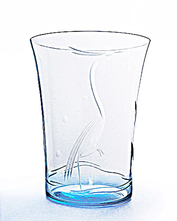 Neusachliche, hellblaue Glasvase mit geschliffenem Reiher-Motiv