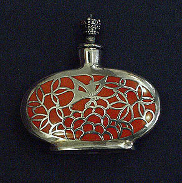 Glaskorpus, überfangen mit vom Motiv an japanische Vorbilder erinnerndem, dicken, silbernen Blätter-Netz mit kleinem Insekt (Schmetterling?). Kronen-artiger Drehverschluß, Höhe ca. 6 cm, geringe Gebrauchsspuren. Deutschland (Firma Muelhens / 4711) um 1920.