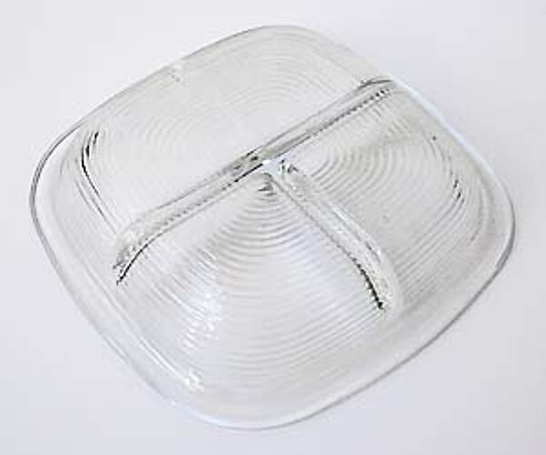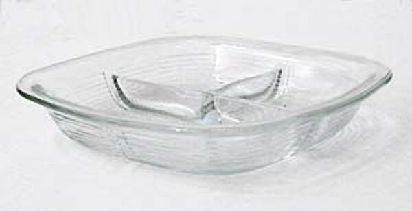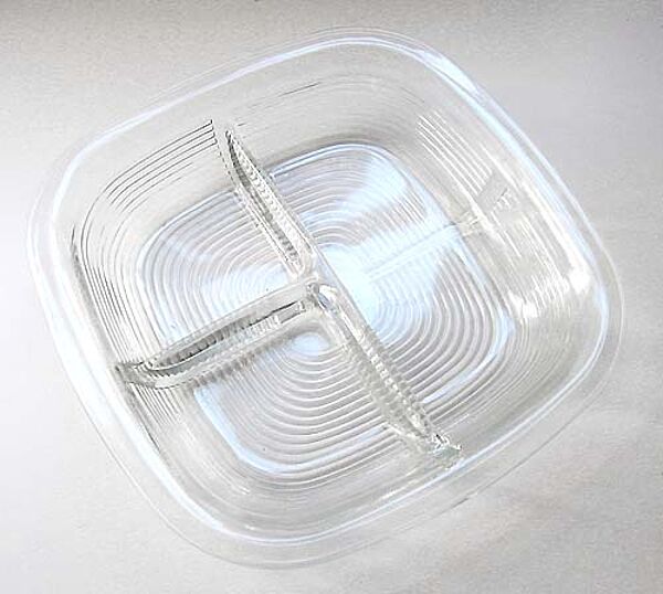 Der in der Grundform quadratische, flach-schüsselartige Korpus aus farblosem, außenseitig gerillten Pressglas hat abgerundete Ecken und innenseitig einen langen und einen kurzen Steg zur Unterteilung. Maße ca. 21 x 21 x 4 cm, diskrete Gebrauchsspuren. Ungemarkt, wohl Deutschland der 20er, 30er Jahre.