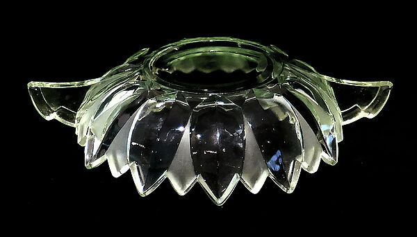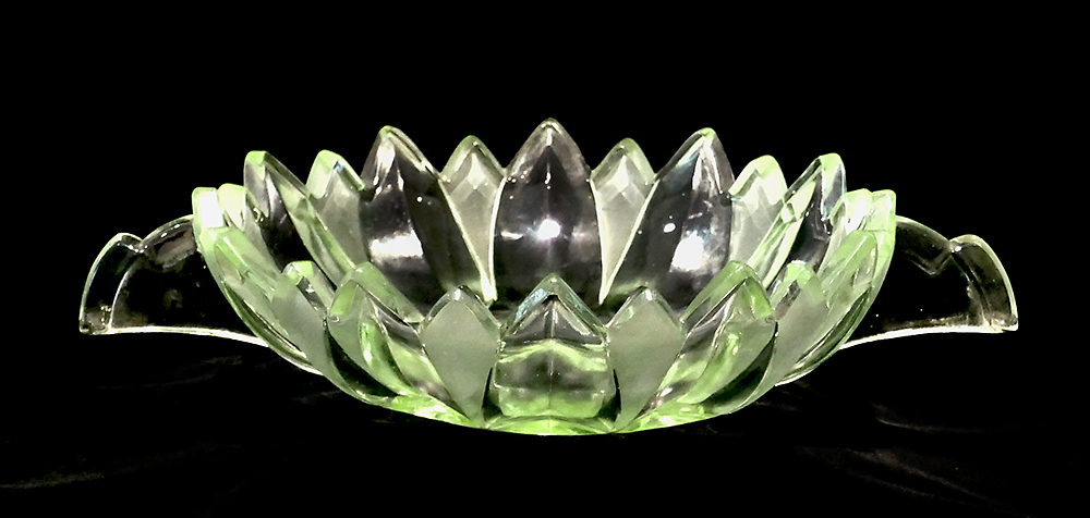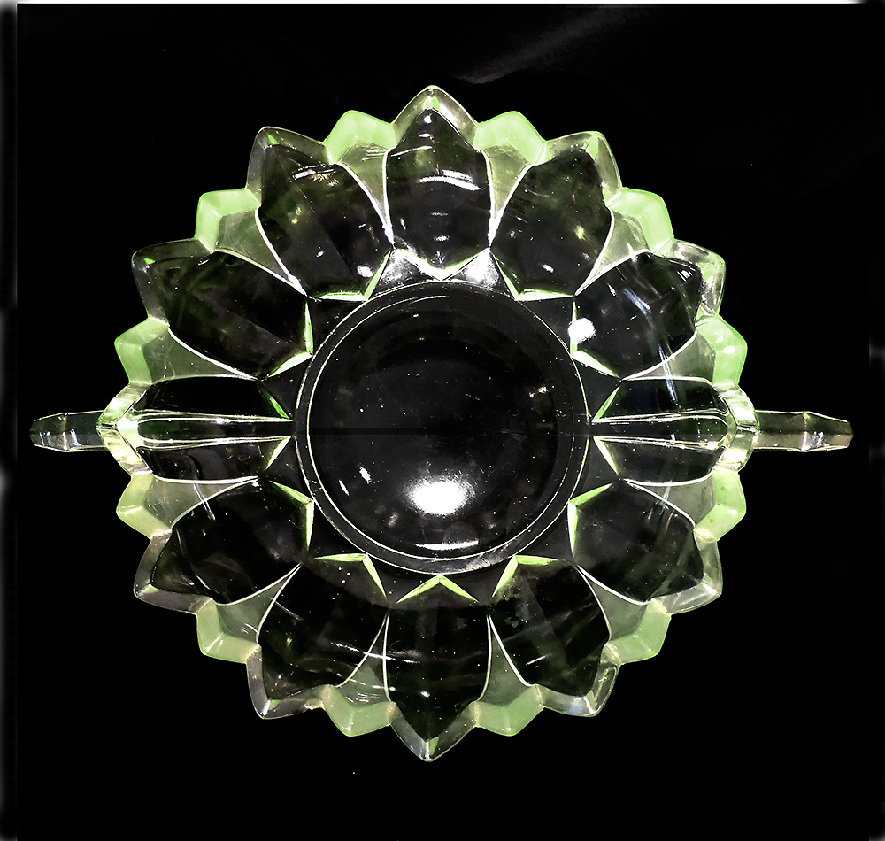Flach schalenförmiger Korpus aus überwiegend klarem, partiell satiniertem, gepresstem Uranglas. Durch den gezackten Rand erinnert das Gefäß an eine stilisierte Blüte. Beidseits langgestreckte Handhaben. Maße ca. 31,5 (von Griff zu Griff) Durchmesser ca. 23,5 cm, Höhe ca. 6 cm, geringe Alters- und Gebrauchsspuren. Wohl Deutschland der 1920er Jahre.