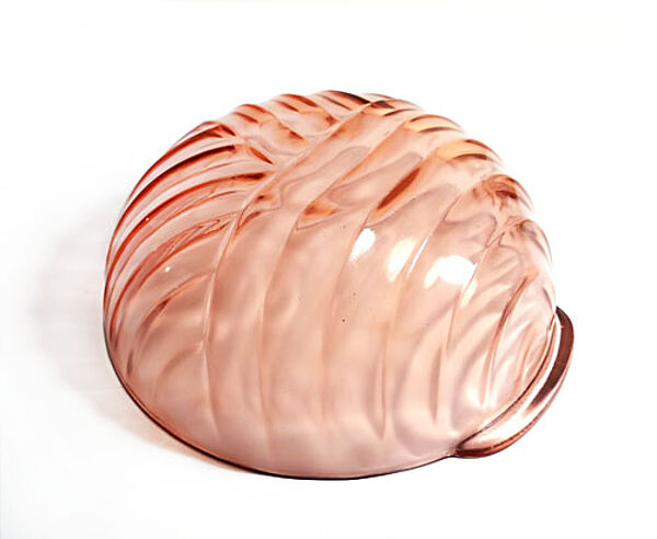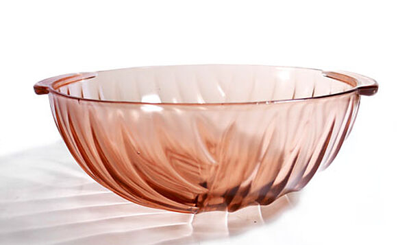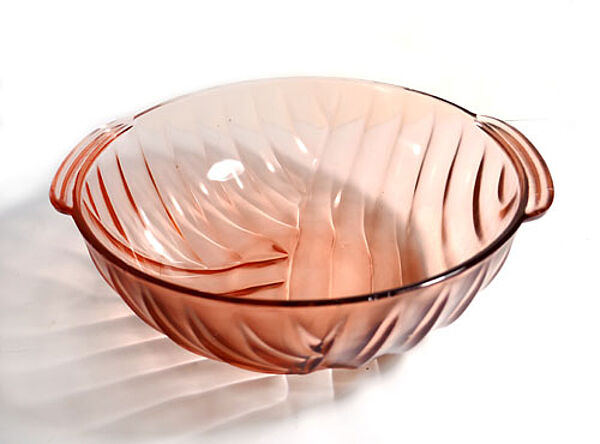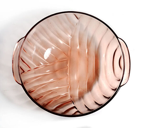 Halbkugel- also klassisch schüsselförmiger Korpus aus transparentem, rosafarbenem Pressglas. An der Außenseite des Randes sind gegenüber liegend zwei schmale, stegartige Handhaben angesetzt. Außenseitig flach reliefiertes Muster: drei zueinander versetzte Felder aus parallel angeordneten Streifen. Durchmesser ca. 20 cm, von Handhabe zu Handhabe ca. 23 cm, Höhe ca. 8 cm, geringe Altersspuren. Wohl um 1920.