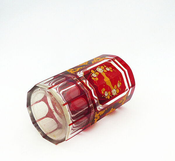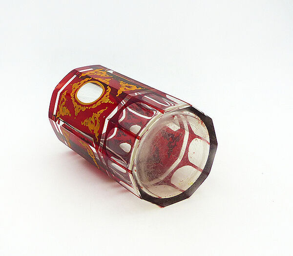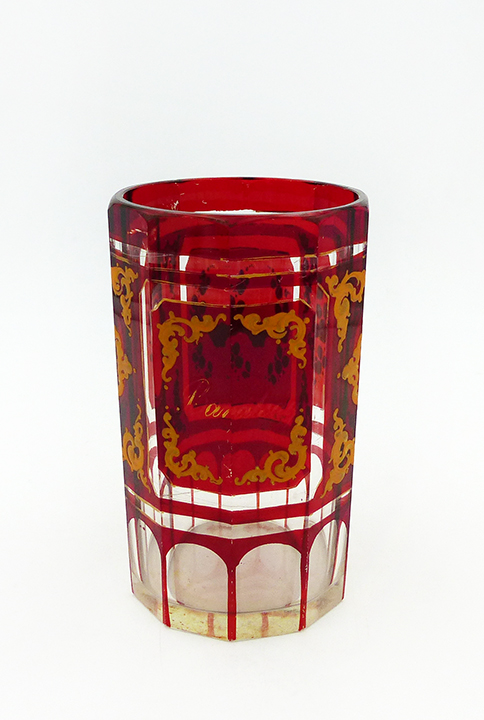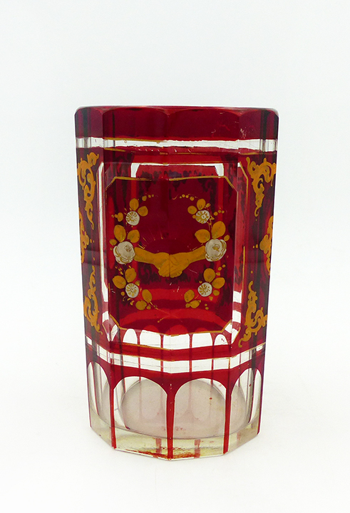Annähernd zylindrischer, am Rand fast runder im leicht verjüngten Standbereich 10 eckiger, mundgeblasener Korpus aus Klarglas, außenseitig überwiegend rubinrot überfangen, hierauf Goldmalerei: vordergründig zwei sich haltende Hände zwischen Blumengirlanden, eine Beschriftung ist so berieben, dass sie nicht mehr lesbar ist, ansonsten moderate Altersspuren. Höhe ca. 14 cm, Durchmesser ca. 8 cm. Wohl Böhmen um 1830 bis 50.