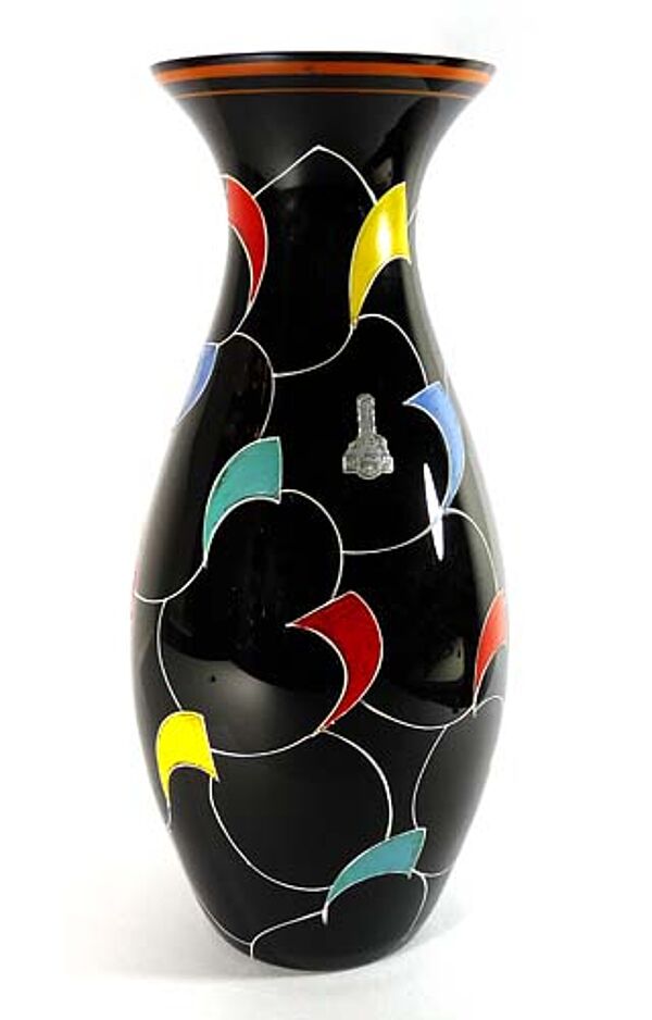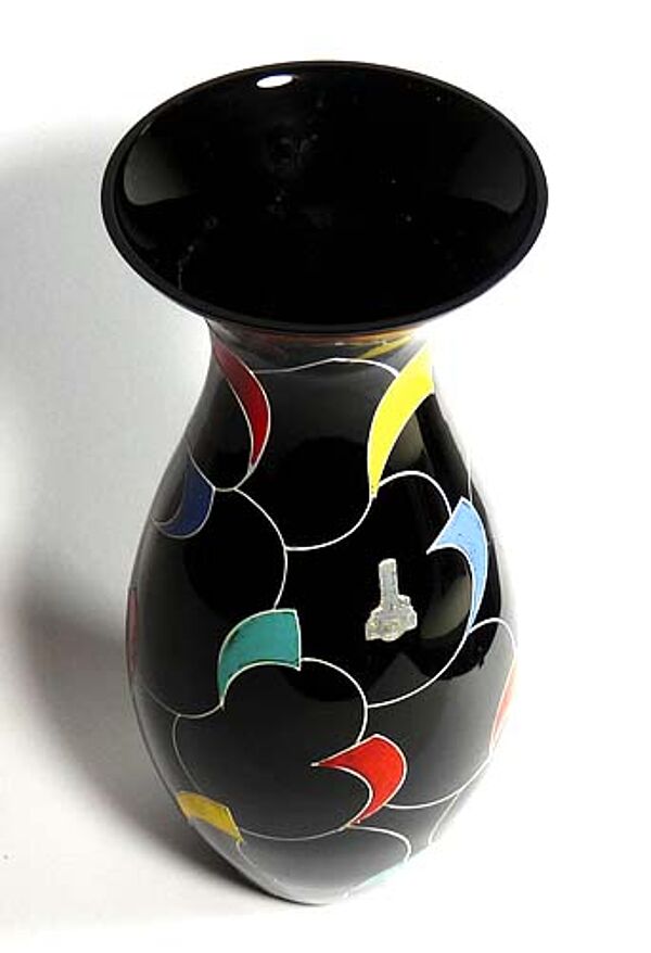 Länglicher, flach gebauchter Korpus aus schwarzem Glas mit ausgestelltem Mündungsrand. Außenseitig handgemaltes polychromes, abstraktes Linien- und Flächendekor (Emaillefarben). Höhe ca. 31,7 cm, geringe Gebrauchsspuren. Ungedeuteter Firmenaufkleber (siehe Foto), wohl Ilmenau der 1950er Jahre.