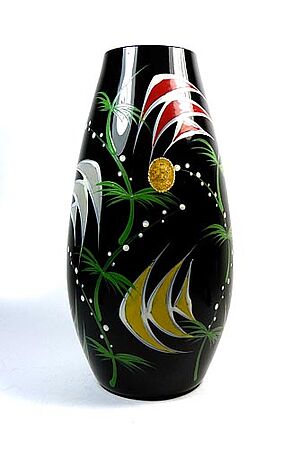 Schwarze Glasvase mit farbiger Emaille-Malerei