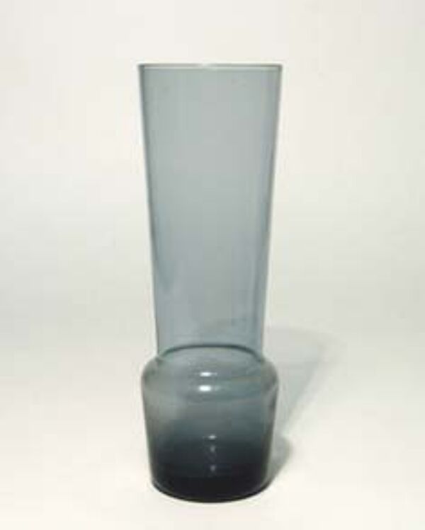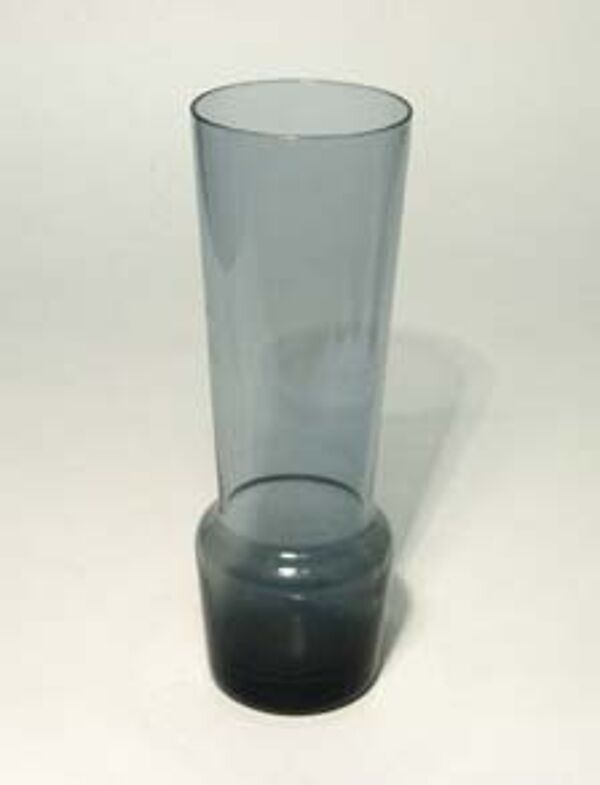 Annähernd stangenförmiger, sich bis zum unteren Viertel verjüngender, hier dann kolbenartig aufgetriebener Korpus aus stahlblauem, dünnwandigen Glas. Höhe ca. 18,2 cm, geringe Gebrauchsspuren. Wohl 1960er, 70er Jahre.