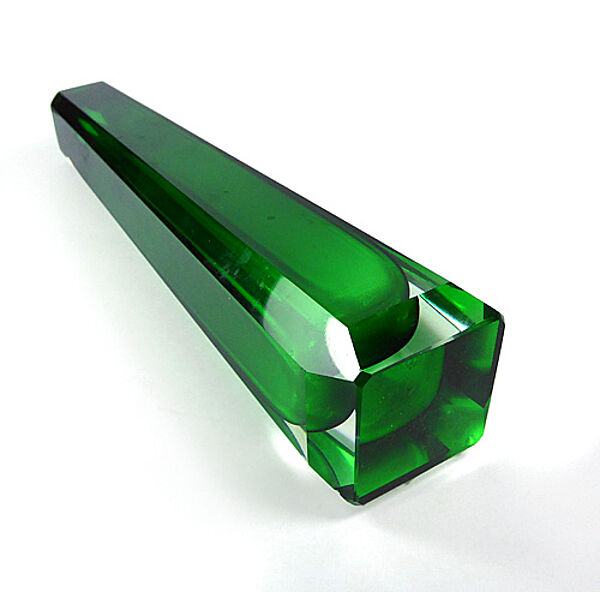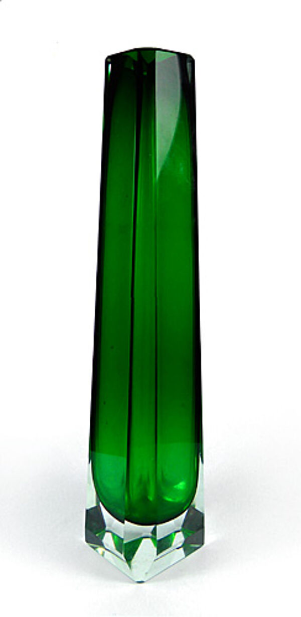 Stelenartiger, nach oben sich leicht verjüngender, facettiert geschliffener Korpus aus klarem Kristallglas, leuchtend grün unterfangen. Höhe ca. 21 cm, geringe Gebrauchsspuren, insbesondere zeigen sich vier winzige Flohbisse im Bereich der geschliffenen Kanten. Wohl Deutschland oder Skandinavien der 1960er Jahre.