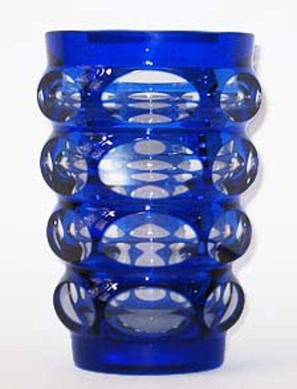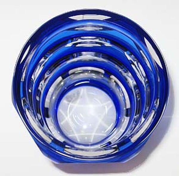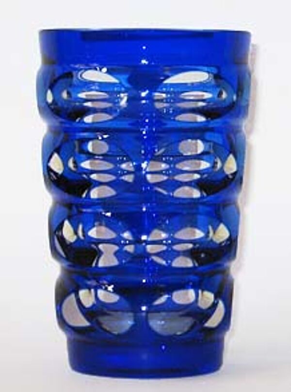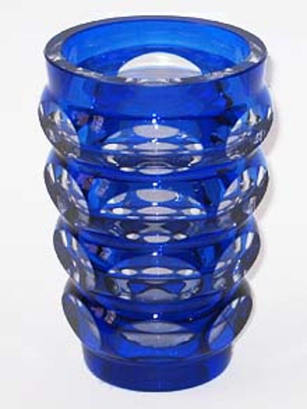 Der sich zum Stand leicht verjüngende Korpus aus dickem, klaren Glas ist blau überfangen und mehrfach eingezogen, so daß insgesamt 5 reifenartige Segmente entstehen, die jeweils 6 plane Beschleifungen aufweisen, so dass linsenartige Dekor-Reihen enstehen. Höhe ca. 12 cm, minimale Gebrauchsspuren. Wohl Haida der 1910er Jahre.
