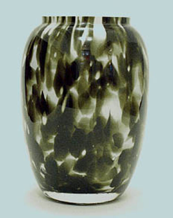 Flach-gebauchte Form, gerade Mündung, H. 18cm, Farbsplitterüberfang, wohl Böhmen der 20er Jahre.