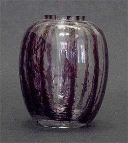 Ovoider Korpus aus klarem Glas mit schweifartigen, violetten Einschmelzungen, kleiner senkrecht ausgestellter Mündungsrand. Höhe ca. 13cm, minimale Gebrauchsspuren. Wohl Deutschland der 20er Jahre.