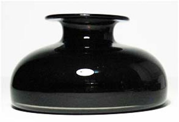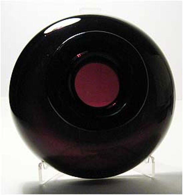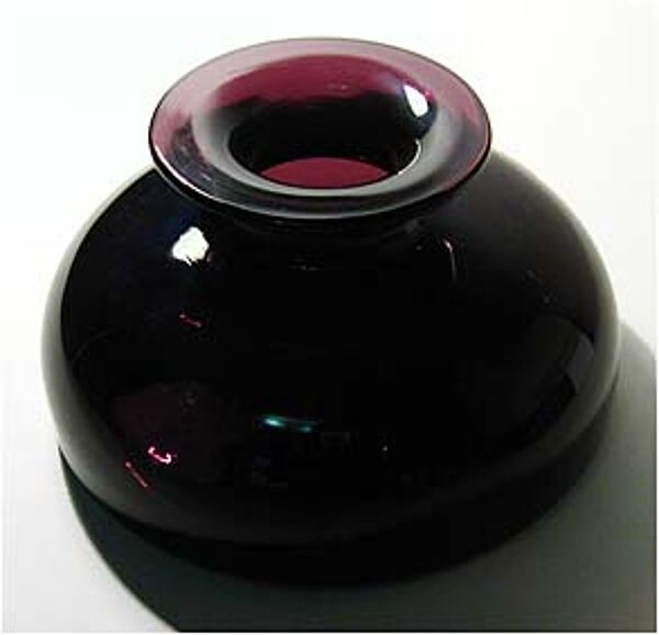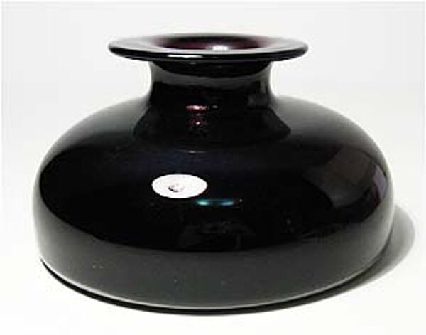 Gedrungener, schwerer, mundgeblasener Korpus aus violettem, klar überfangenen Glas, der sich zu einem schmalen Hals verjüngt, ausgestellter Mündungsrand. Max. Durchmesser ca. 15 cm, Höhe ca. 8 cm, minimale Gebrauchsspuren. Unbezeichnet, evtl. Skandinavien der 60er, 70er Jahre (oder doch frühere Arbeit ??).