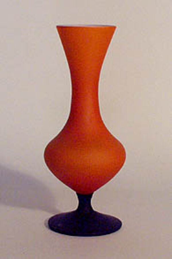 Langgestreckter, deutlich taillierter, im unteren drittel gebauchter Korpus aus innen hellem, außen orange überfangenen Glas auf dunkelblauem Stand. Minimale Gebrauchsspuren, Höhe ca. 17cm.