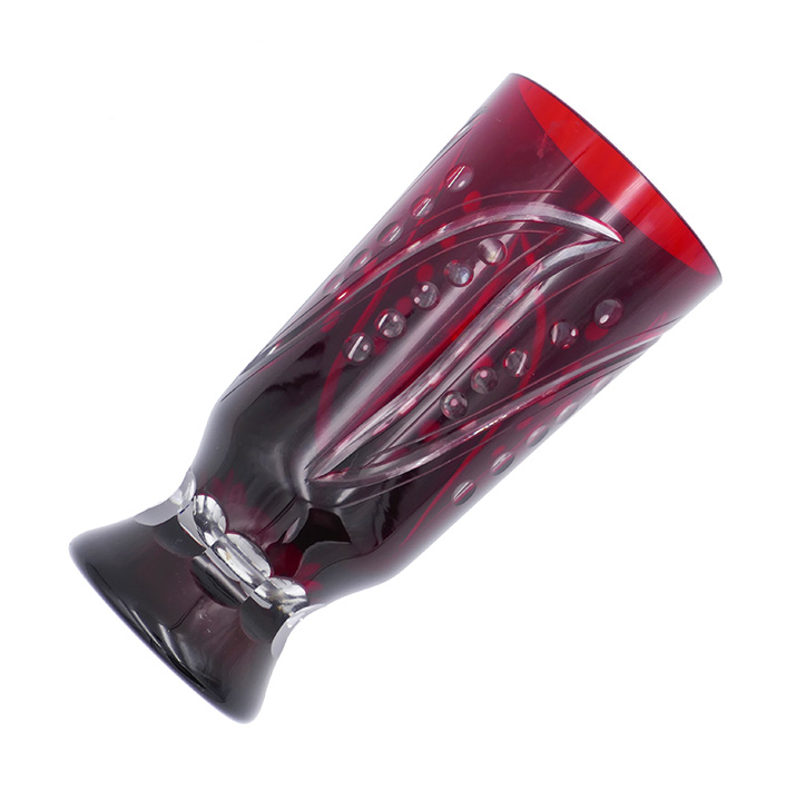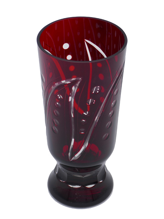 Pokal-artiger, mundgeblasener Korpus aus klarem Kristallglas, dunkel-rubinrot überfangen. Handgeschliffenes stilisiertes Streifen- und Punktedekor, entfernt an stilisierte Maiglöckchen erinnernd. Unterseitig flach ausgeschliffener Abriß. Höhe ca. 14 cm, geringe Altersspuren. Wohl Böhmen der 1920er Jahre.