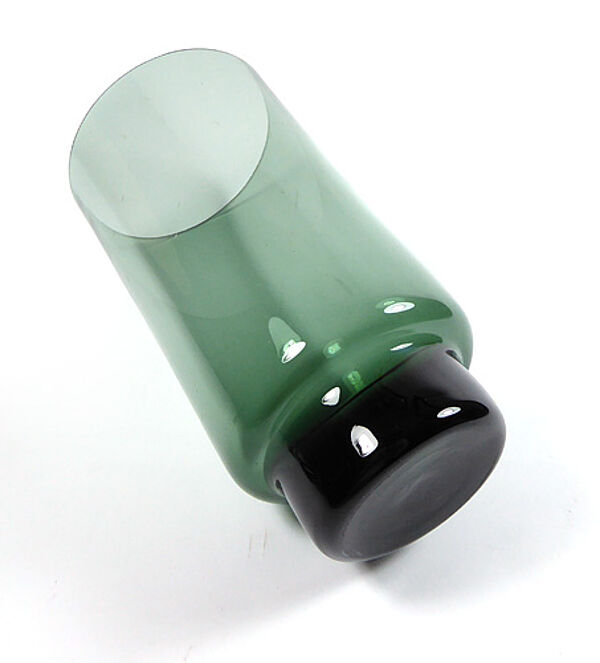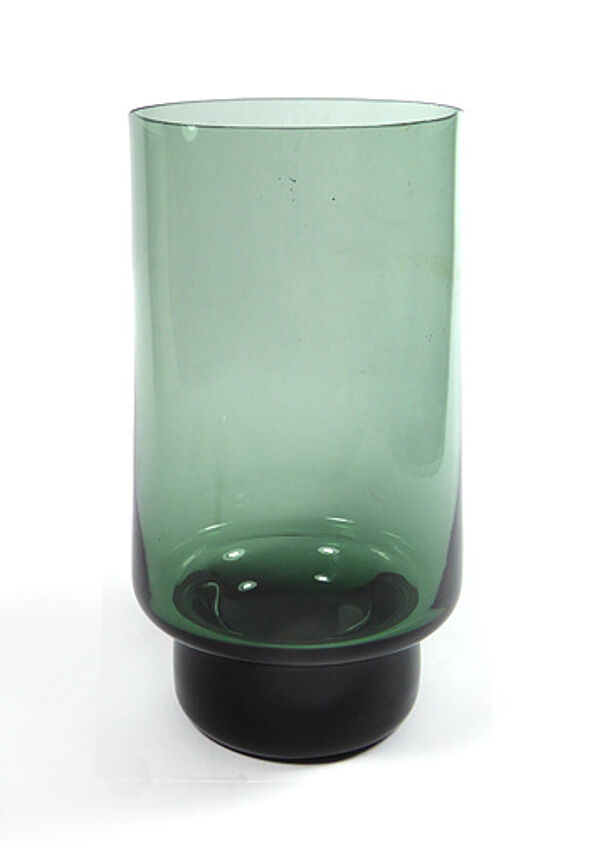 Zylindrischer Korpus aus in die Form geblasenem, turmalin-grünen Glas, eingezogener Vollglassockel. Gesamthöhe ca. 16 cm, Öffnungsdurchmesser ca. 8 cm, geringe Gebrauchsspuren. Wohl Deutschland der 1970er Jahre.
