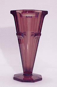 Trichterförmiger Korpus aus dunkelviolettem Farbglas, scheibenförmiger Fuß, achteckige Facettierung der Vase. Einfaches geometrisches Dekor (erhabene Stege). H. ca. 21cm, dunkelviolettes Glas. Evtl. Frankreich der 20er Jahre.