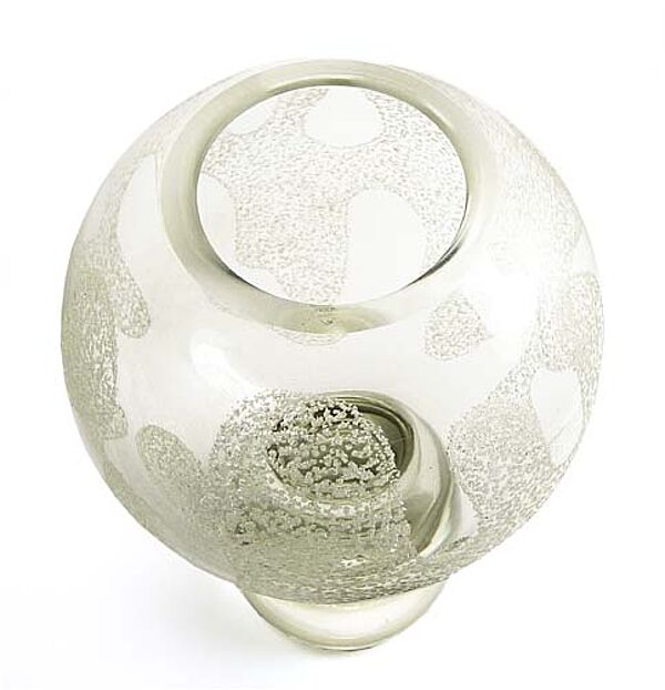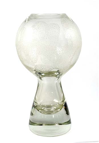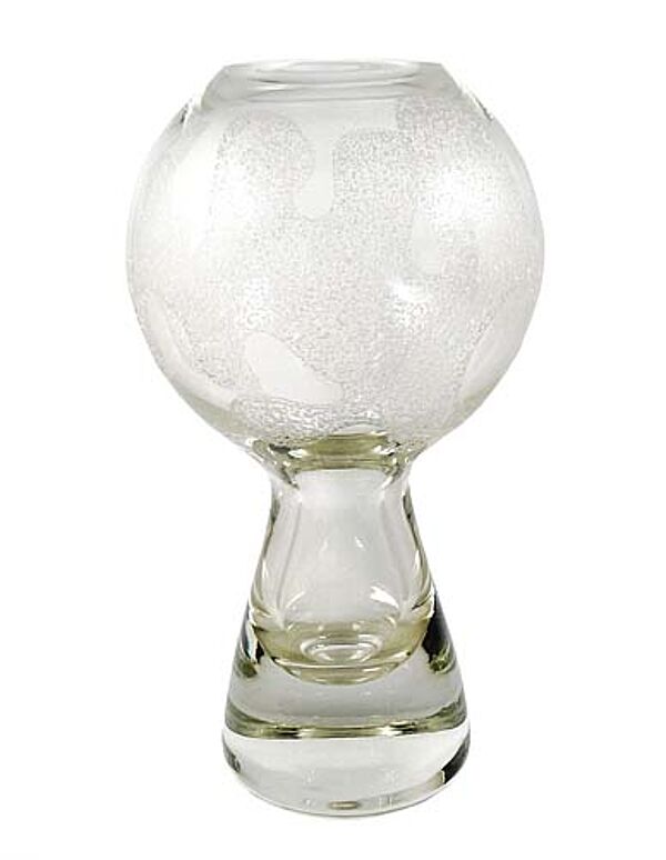Mittig taillierter, im oberen Teil betonter, hier fast kugelförmiger Korpus aus farblosem, mundgeblasenen Glas. Im oberen, kugelförmigen Teil diamantgestipptes Dekor in Form "organischer" Inseln. Höhe ca. 16,5 cm, minimale Gebrauchsspuren. Entwurf wohl von 1977.