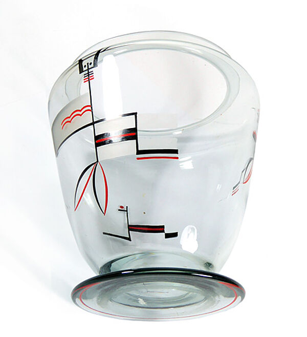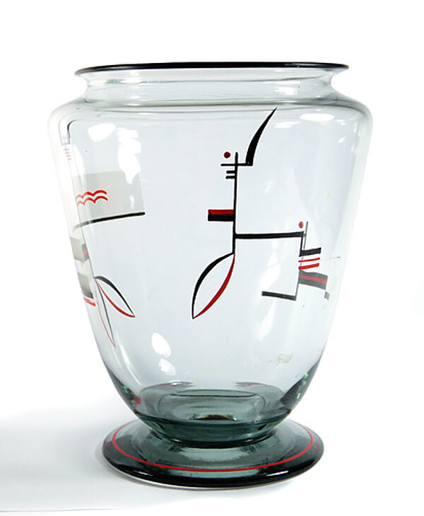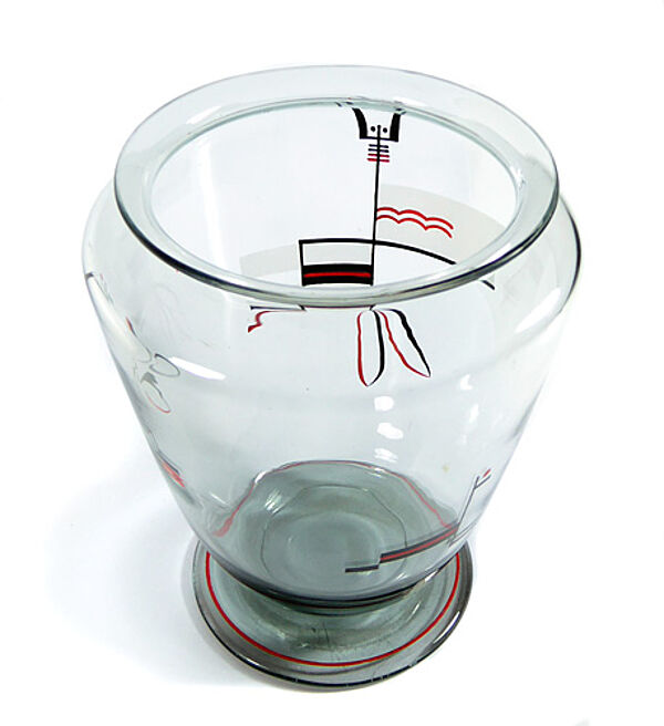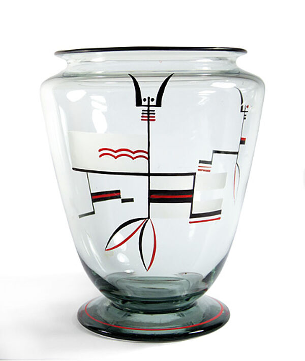 Hell-turmalin-farbener, klarer, in die Form geblasener, gefusster Glaskorpus, der sich zur Schulter hin allmählich verbreitert und dann in einem schmal abgesetzten und leicht ausgestellten Rand abschließt. Abstraktes, mit Emaillefarben in schwarz und rot aufgetragens Dekor, welches von der Malerei (Miro, Ernst) der Zeit, also der 1920er Jahre beeinflusst worden sein dürfte . Höhe ca. 16,5 cm, geringe Altersspuren.
