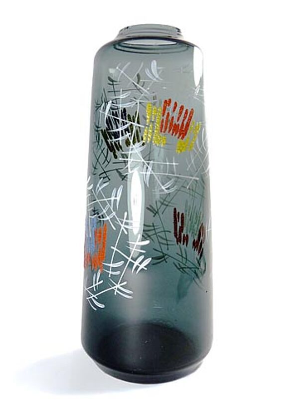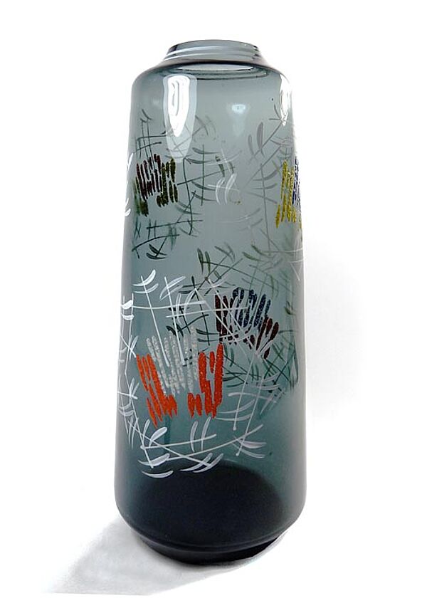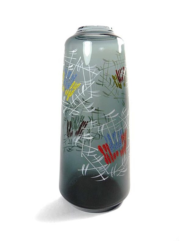 Annähernd zylindrischer, sich zum schmalen, leicht ausgestellten Mündungsrand geringgradig verjüngernder Korpus aus transparentem, bläulichen Glas. Außenseitig ist ein handbemaltes, abstaktes Liniendekor mit polychromen Emaille-Farben aufgebracht. Höhe ca. 24,5 cm, es zeigen sich einige kleine Chips am Mündungsrand, ansonsten nur geringe Gebrauchsspuren. Wohl Deutschland der 60er Jahre.