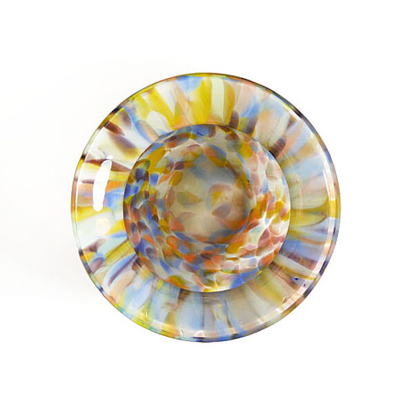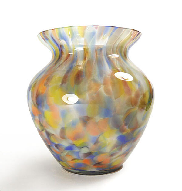 In die Form geblasener, angedeutet herzförmiger Korpus mit ausgestelltem Mündungsrand aus klarem Glas, flockenartig-polychrom unterfangen. Polierter Rand. Höhe ca. 15 cm, minimale Alters- und Gebrauchsspuren. Wohl Deutschland der 1920er bis 30er Jahre.