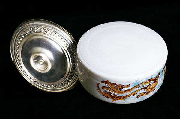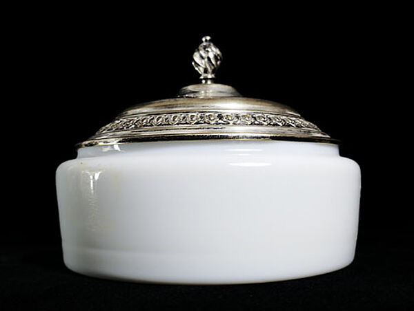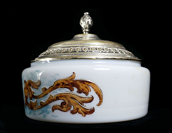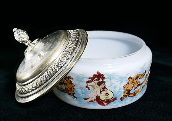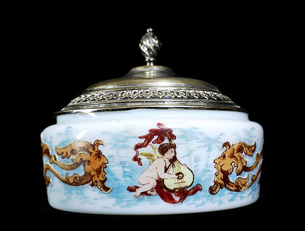 Weißer, opaker, runder Glaskorpus, außenseitig (schauseitig) Motiv einer Mandoline spielenden, Putte, die von zwei floralen Fantasiewesen mit Gesichtern flankiert wird. Versilberter Metalldeckel. Höhe mit Deckel ca. 13 cm, Durchmesser der Dose ca. 12,5 cm, die Versilberung des Deckels ist stark berieben, ansonsten eher geringe Altersspuren. Wohl Skandinavien (vermutlich Dänemark) um 1880 bis 1900 (Gründerzeit mit "Anklängen" von Jugendstil)