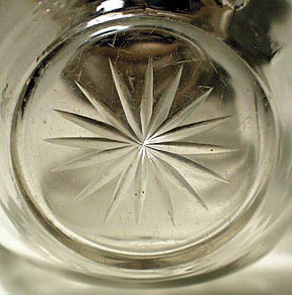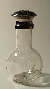 Im unteren Drittel gebauchter (und hier auch mehrfach leicht eingedrückter) Korpus mit schlankem Hals aus klarem Glas. Sternenförmiger Schliff auf der Bodenunterseite. Schraubverschluß aus verchromtem oder vernickelten Metall, der punkt- und sternförmig durchbrochen ist. Höhe ca. 16 cm. Leichte Gebrauchsspuren an der Bodenunterseite, an einer Stelle winzige Oberflächenbestoßung. Ungemarkt, wohl Deutschland um 1915.