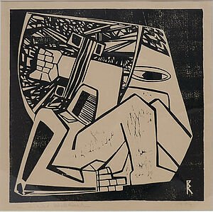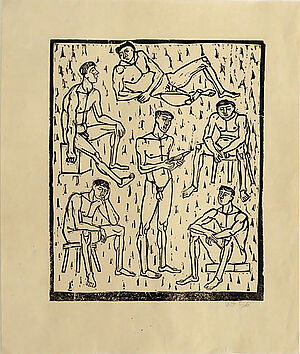 Holzschnitt: o.T. (figürlich-abstrahierte Darstellung eines ruhenden männlichen Aktes, der ein Schild trägt)