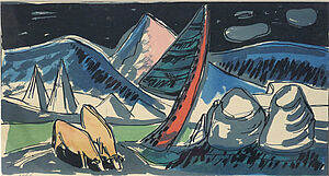 Farblithografie: o.T. (Gebirgslandschaft mit Schafen)