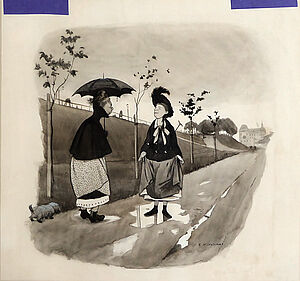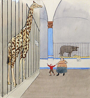 Aquarellierte Tuschzeichnung: Entwurfszeichnung für die Fliegenden Blätter (Mutter und Kind m Zoo)