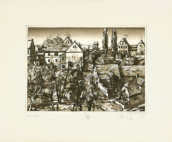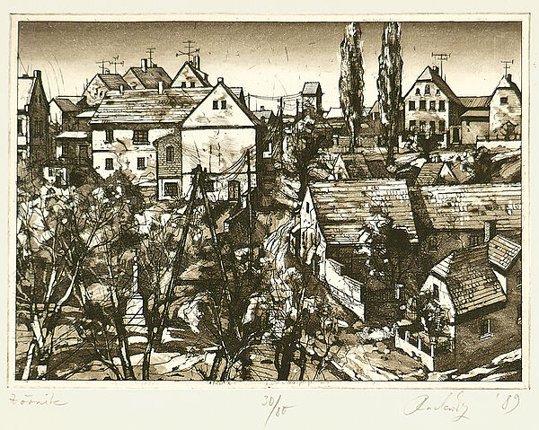 Radierung auf chamoistonigem, kräftigen Papier. Rechts unter der Darstellung mit Bleistift handsigniert und datiert (19)"89", linksseitig betitelt sowie mittig auflagenbezeichnet “30/80”. Plattenmaße ca. 17 x 23,7 cm, Blattmaße ca. 28 x 33,5 cm, geringe Alters-, Griff- und Lagerspuren.