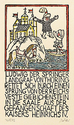 Kolorierter Holzschnitt: Ludwig der Springer / Giebichenstein